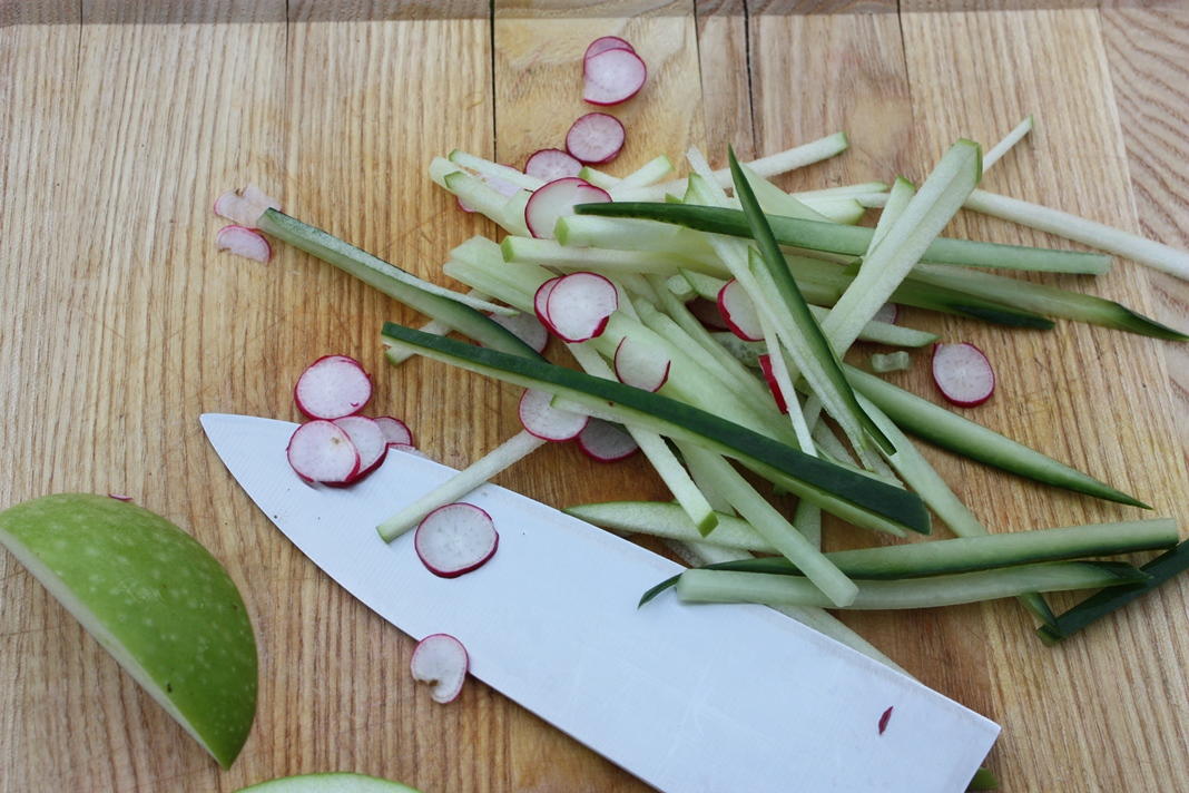 Cut the cucumber and apple into very fine batons and slice the radish on the round, ideally through a mandolin or carefully with a knife. Mix all 3 ingredients together with a splash of olive oil, lemon juice and grind of black pepper.