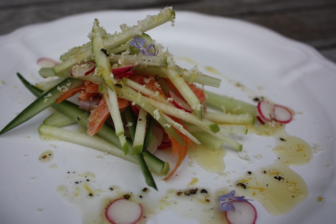 Delicate, smokey, moist, and importantly boneless, the ‘hot smoked’ trout had me smitten. It was savvy, subtle, intense, yet not overpowering, it was divine and so versatile that the endless possibilities at what I could marry with it led to quite a sleepless night. First time out it was the obvious, cucumber, radishes, granny smith apple, shaved horseradish and lemon dressing. Clean, crisp, shockingly healthy but equally punchy on taste, this is the perfect ‘palate pleaser’ for a summer dinner party. Always a fan of food looking pretty, this also wins hands down.