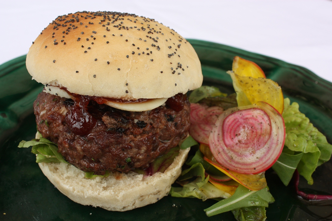 Rain or shine we tend to use the bbq most weekends, we cook fish, squid, scallops, prawns, chicken, Poussin, shoulders of lamb, legs of lamb, racks of lamb, even a rib of beef and most importantly burgers! I am a burger lover and ever since childhood have made my own. My mother used to have one of those nifty stamping out burger gadgets – thrilling for any child, now I just hand shape my own patties having mixed the beef mince with a few other key ingredients. This list of ingredients is a bit of a moveable feast and slighty depends what is in the store cupboard, it includes some or all of the following – onion, fresh thyme, parsley, chives ketchup, Lea and Perrins, mustard, chilli flakes and the wild card for this year, ‘capers’. I admit, a little random but actually the magic ingredient!