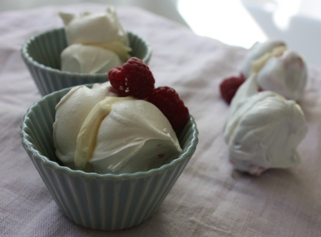 ‘Bingo’, a home for lone egg whites and a pudding for ‘little and big’ people. Meringues in my eyes are the versatile, easy and cheap dessert option. What is more, meringues keep, stored in an air tight container, they can be kept for several days, and just when their quality is beginning to weaken, can be crumbled into homemade ice cream or into an Eton Mess. On my frantic friday bake-off, I made a tray of virgin white meringues and then with the left over mix, crushed in some raspberries from the garden – the result was delicious with the slightly sour raspberry biting through the sweetness of the meringue – well worth a go if you are feeling adventurous! Once you have mastered making these delectable morsels they will become integral to your cooking repertoire because they are just so easy, and so very useful to have loitering around, more useful than in a pot in the back of the fridge!!
