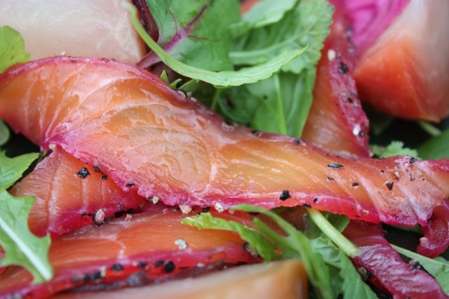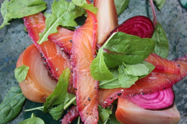 Beetroot cured salmon with fresh horseradish and bitter leaves