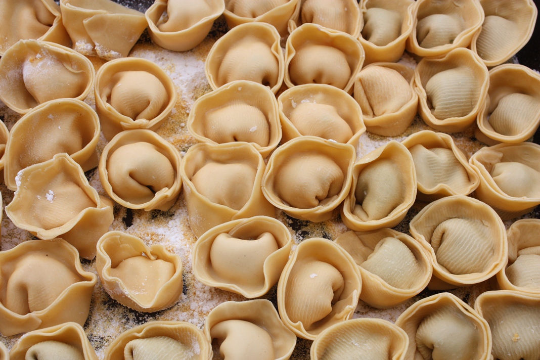 This will make more than enough pasta for tortellini for 4 people as a starter or 2 as a main course. Anything extra you can always keep aside as plain sheets for lasagne or make parpadelle! To cater for more I would jump to 400gms of flour and 6 egg yolks. BUT please note this is merely a guideline, the aim is to make a pliable dough, not indifferent in texture and feel to ‘playdoh’ , so if the mix is too dry just add in more egg yolks until it comes together and forms a dough. My brief experience of making pasta is to be guided by how it feels as opposed to the recipe as the size of the eggs makes a huge difference so do go on instinct instead of hard and fast recipe quantities!
