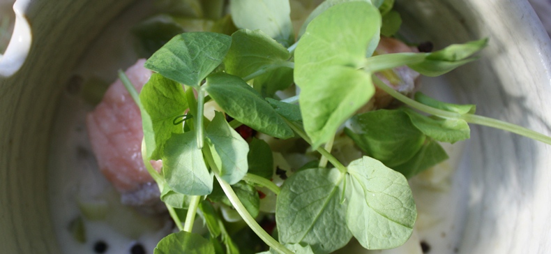 Fresh Pea Shoots (optional) to serve on top and pink peppercorns to garnish