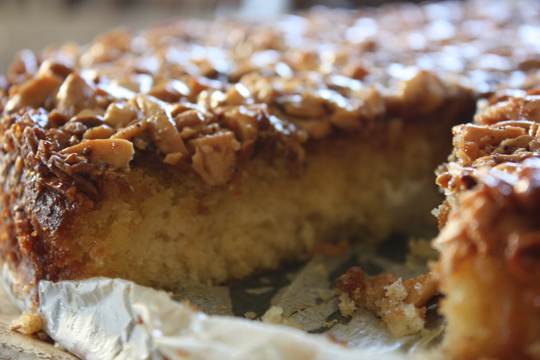 While the cake is in the oven make the topping (ideally about 10 minutes before it is baked – but that is real precision). Place the butter, sugar and milk, salt, espresso powder in a saucepan and stir while the butter melts. Keep it on the heat for 4 -5 minutes and then pull off. Now turn the oven up to 200C, instantly remove the cake and pour the almond caramel mix over the top. Make sure it is evenly spread and then pop back in the oven on a baking tray for 8-10 minutes until the topping is golden, caramel brown and bubbling. Place in the top of the oven and bake for 8-10 minutes until the glaze is deep brown and bubbling. Remove and allow to cool.