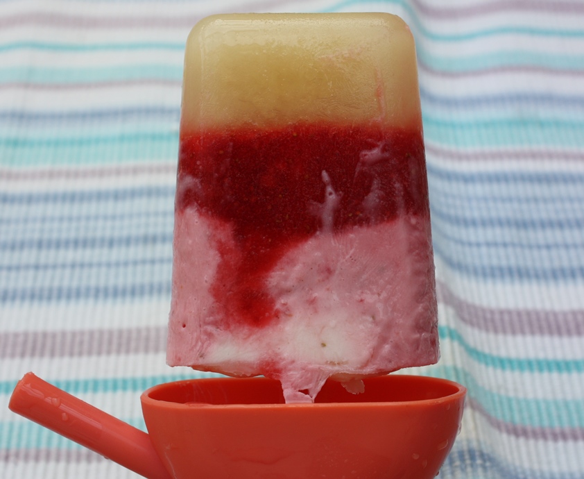 lolly2This has to be the best thing I have bought this summer. Certainly the ‘little people’ would vote for it, and possibly Mr.P to as it has inadvertently saved him a fortune on shop bought lollies and ices. Not only has this charming delight of a lolly pop maker saved the pennies it has also, unbelievably and slightly unintentionally, made the ‘pink’ and ‘blue’ eat things they never would have dreamed of! Gooseberry and blackcurrant for starters, who would have thought; added to which there is huge excitement in making the lolly pops and a vast amount of anticipation for the lolly masterpiece that is revealed, but only after all the ‘trees’ (brocolli to you and me) have been consumed. To be honest we have not been that adventurous in lolly pop mixology, the flavor combinations have been dictated mainly from what fruit is about to turn and hence is rescued from the firing line by being rapidly pureed and slung into the lolly moulds. Our signature pop goes something like this; ‘Cawston Apple Juice’ on the bottom, strawberry or raspberry puree, sweetened with a touch of honey, followed by a fruit puree mixed with natural yogurt. So simple yet it knocks the socks off most pops!